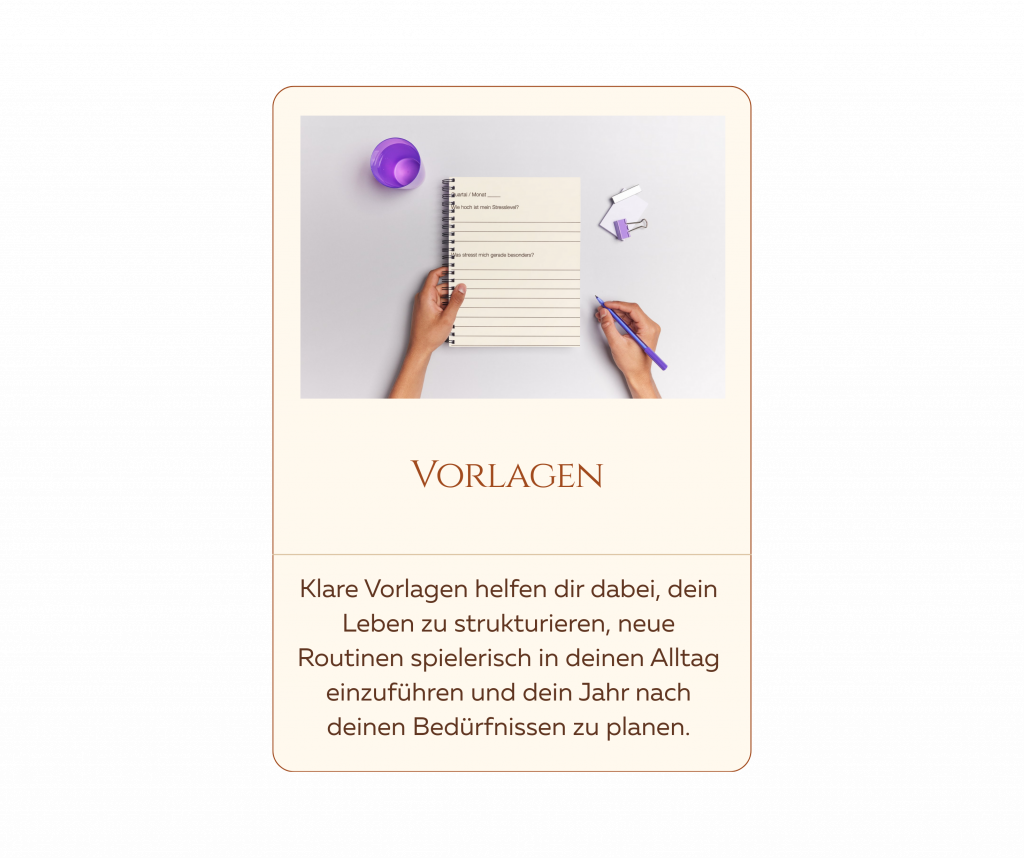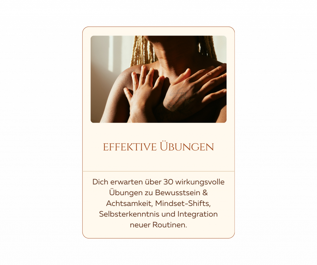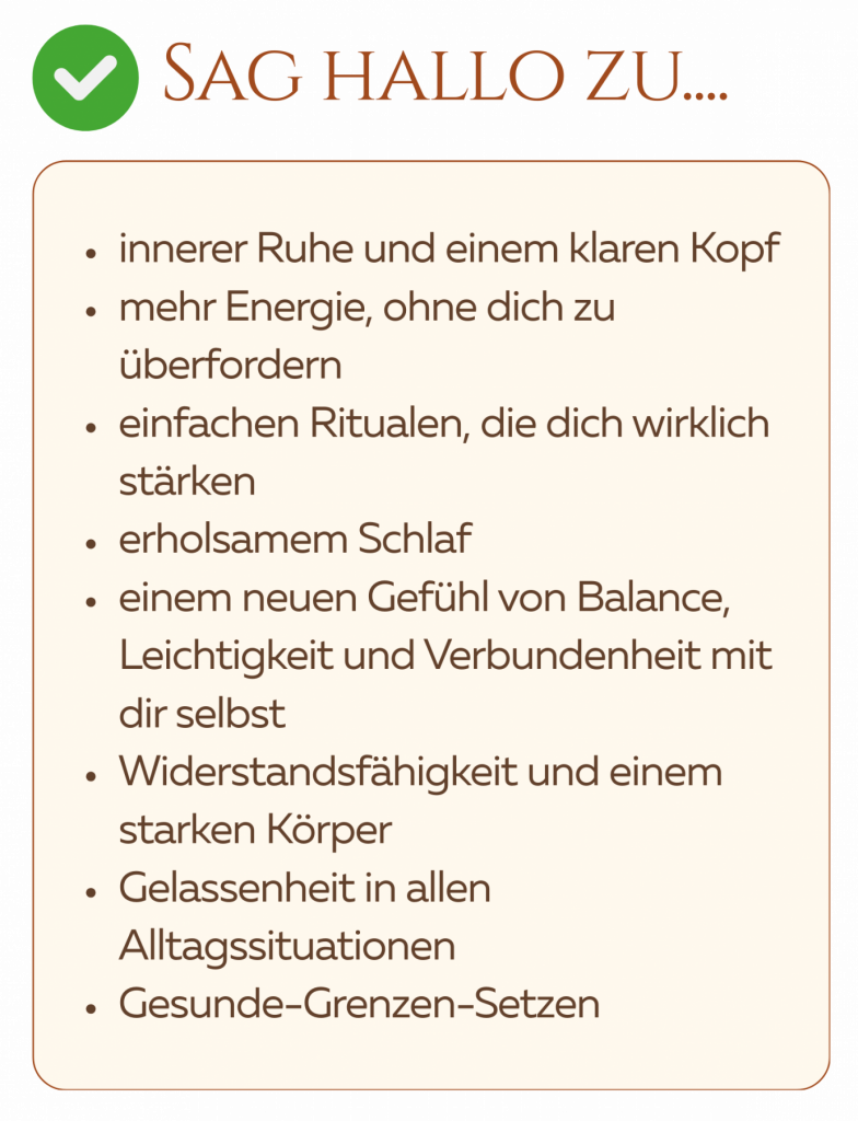 Alles so aufgebaut, dass du Schritt für Schritt und in deinem Tempo mehr Klarheit, Ruhe und innere Stärke entwickelst und dich mehr und mehr mit dir verbindest.