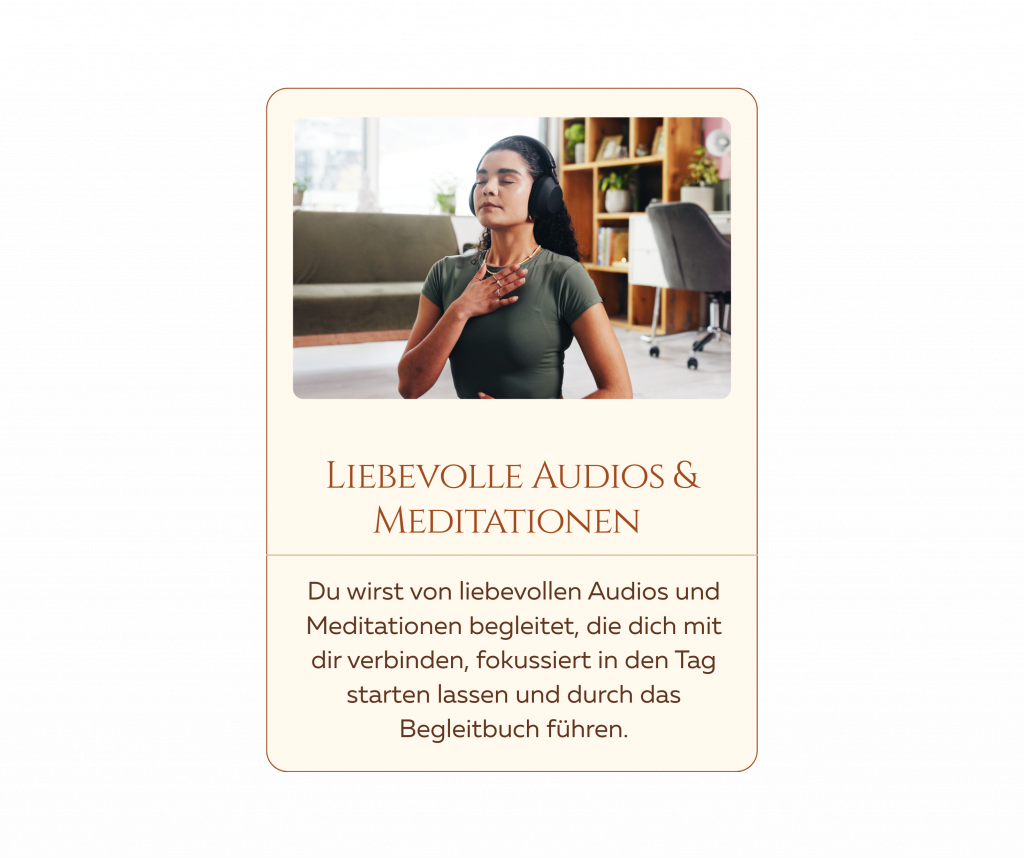 Du erhältst ein liebevoll gestaltetes Begleitbuch mit über 100 Seiten sowie ergänzende Audios, geführte Meditationen, praktische Übungen, Vorlagen zur Selbstreflexion und alltagstaugliche Foodhacks für mehr innere Balance.