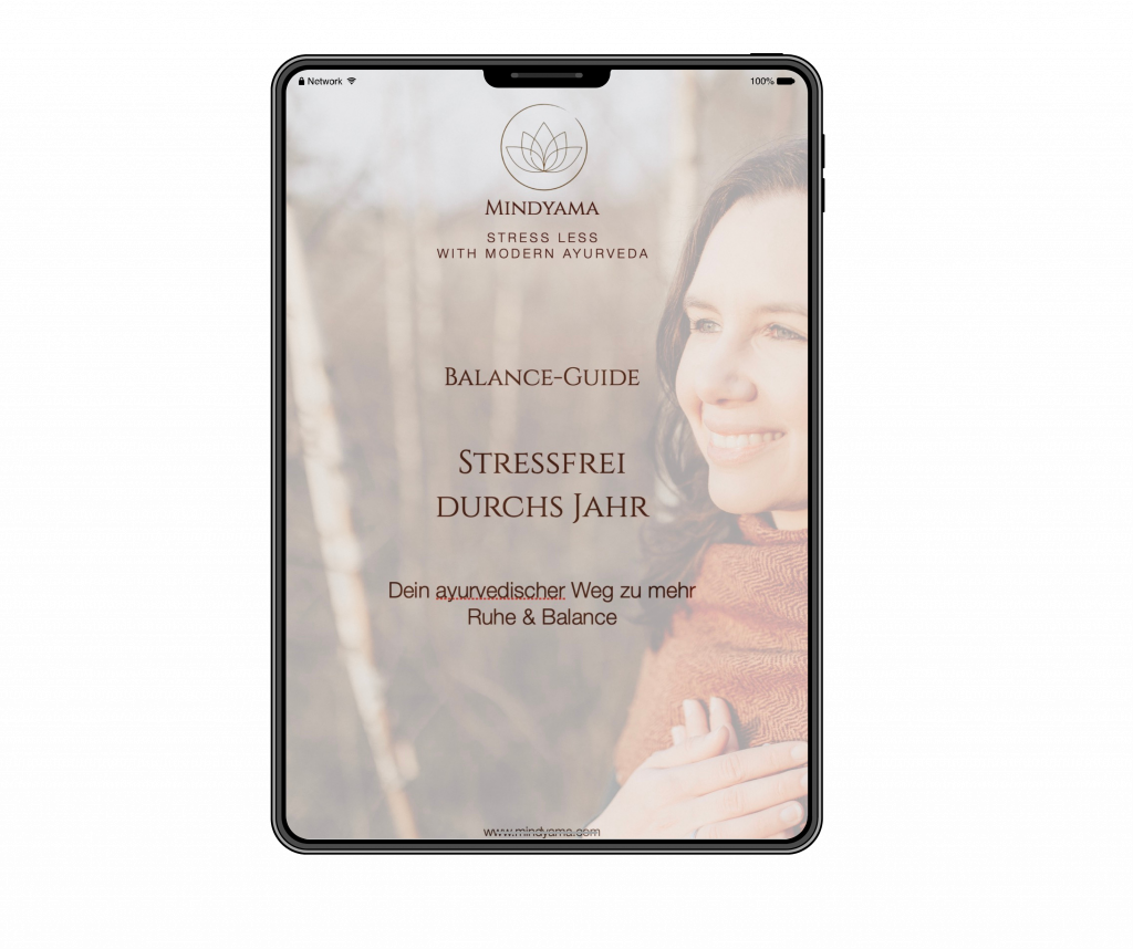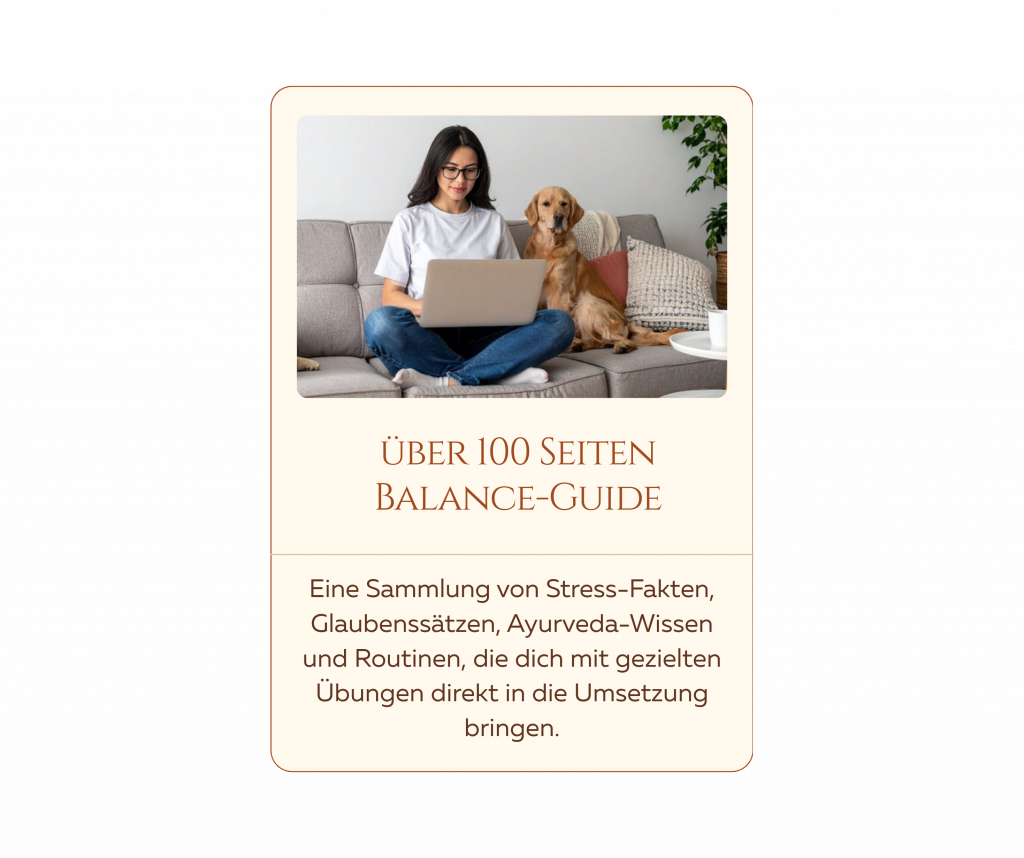 Was dich erwartet, sind Audios, Meditationen, wirkungsvolle Übungen, nützliche Vorlagen, ein Dosha-Stress-Test und über 100 Seiten Balance-Guide zu mehr Gelassenheit im Alltag.